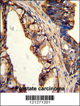 Formalin-fixed and paraffin-embedded human prostate carcinoma with TGM4 Antibody (Center), which was peroxidase-conjugated to the secondary antibody, followed by DAB staining. This data demonstrates the use of this antibody for immunohistochemistry; clinical relevance has not been evaluated.