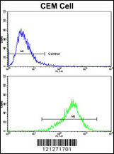 Flow cytometric analysis of CEM cells using TGM4 Antibody (Center)(bottom histogram) compared to a negative control cell (top histogram). FITC-conjugated goat-anti-rabbit secondary antibodies were used for the analysis. |