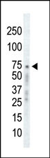 Western blot analysis of anti-GRK2 C-term Pab (Cat. APR14068G) in Ramos cell lysate. GRK2 (arrow) was detected using purified Pab. Secondary HRP-anti-rabbit was used for signal visualization with chemiluminescence.