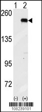 Western blot analysis of GCN2 (arrow) using GCN2 Antibody (N-term G11) (Cat. AMM08571G). 293 cell lysates (2 ug/lane) either nontransfected (Lane 1) or transiently transfected with the GCN2 gene (Lane 2) (Origene Technologies).