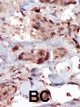 Formalin-fixed and paraffin-embedded human cancer tissue reacted with the primary antibody, which was peroxidase-conjugated to the secondary antibody, followed by AEC staining. This data demonstrates the use of this antibody for immunohistochemistry; clinical relevance has not been evaluated. BC = breast carcinoma; HC = hepatocarcinoma. |