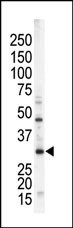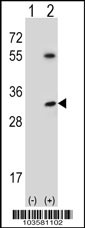 Western blot analysis of STK16 (arrow) using rabbit polyclonal STK16 Antibody (S32) (Cat. AMM08586G). 293 cell lysates (2 ug/lane) either nontransfected (Lane 1) or transiently transfected (Lane 2) with the STK16 gene. |