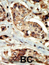 Formalin-fixed and paraffin-embedded human cancer tissue reacted with the primary antibody, which was peroxidase-conjugated to the secondary antibody, followed by DAB staining. This data demonstrates the use of this antibody for immunohistochemistry; clinical relevance has not been evaluated. BC = breast carcinoma; HC = hepatocarcinoma.