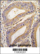 Formalin-fixed and paraffin-embedded human colon carcinoma tissue reacted with PHB2 Antibody (N-term) (Cat. AMM08674G), which was peroxidase-conjugated to the secondary antibody, followed by DAB staining. This data demonstrates the use of this antibody for immunohistochemistry; clinical relevance has not been evaluated. |