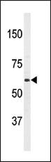 Western blot analysis of anti-PAT1(APPBP2) Antibody (Center) (Cat. APR14237G) in HL60 cell line lysates (35ug/lane). PAT1(arrow) was detected using the purified Pab. |