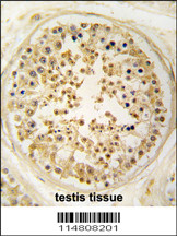 Formalin-fixed and paraffin-embedded human testis tissue reacted with EARS2 antibody (C-term) (Cat. APR10837G), which was peroxidase-conjugated to the secondary antibody, followed by DAB staining. This data demonstrates the use of this antibody for immunohistochemistry; clinical relevance has not been evaluated. |