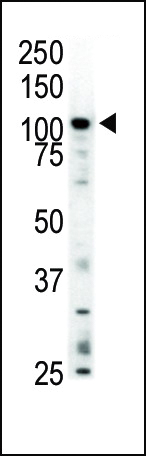 Western blot analysis of anti-MERK Pab (Cat. APR14130G) in NIH/3T3 cell lysate. MERK (arrow) was detected using purified Pab. Secondary HRP-anti-rabbit was used for signal visualization with chemiluminescence.