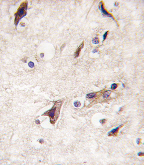 Formalin-fixed and paraffin-embedded human brain tissue reacted with MERK antibody (N-term), which was peroxidase-conjugated to the secondary antibody, followed by DAB staining. This data demonstrates the use of this antibody for immunohistochemistry; clinical relevance has not been evaluated. |