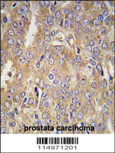 Formalin-fixed and paraffin-embedded human prostata carcinoma tissue reacted with LTBP1 antibody (C-term) (Cat. AMM08593G), which was peroxidase-conjugated to the secondary antibody, followed by DAB staining. This data demonstrates the use of this antibody for immunohistochemistry; clinical relevance has not been evaluated. |