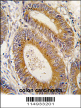 Formalin-fixed and paraffin-embedded human colon carcinoma tissue reacted with YARS2 antibody (N-term) (Cat. APR10853G), which was peroxidase-conjugated to the secondary antibody, followed by DAB staining. This data demonstrates the use of this antibody for immunohistochemistry; clinical relevance has not been evaluated. |