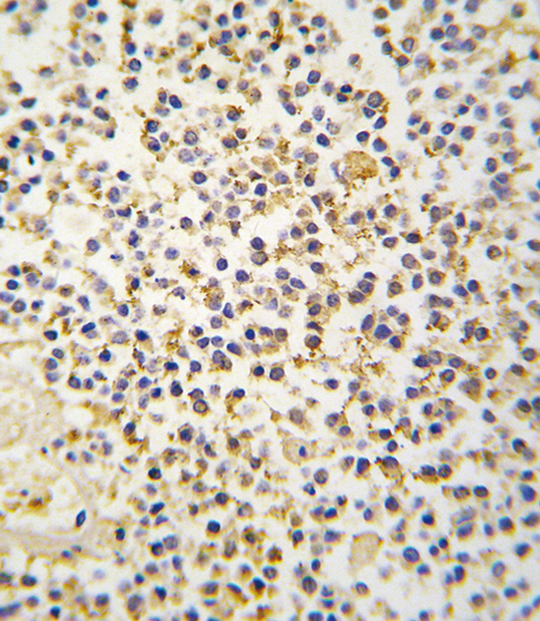 Formalin-fixed and paraffin-embedded human kideny tissue reacted with ALDH1A3 antibody (N-term), which was peroxidase-conjugated to the secondary antibody, followed by DAB staining. This data demonstrates the use of this antibody for immunohistochemistry; clinical relevance has not been evaluated. |