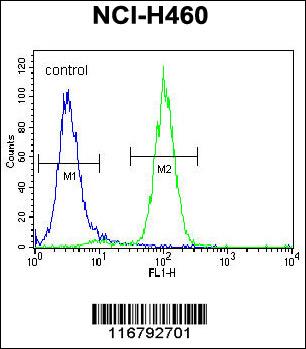 ACHE Antibody (N-term) (Cat. APR14078G) flow cytometric analysis of NCI-H460 cells (right histogram) compared to a negative control cell (left histogram).FITC-conjugated goat-anti-rabbit secondary antibodies were used for the analysis. |