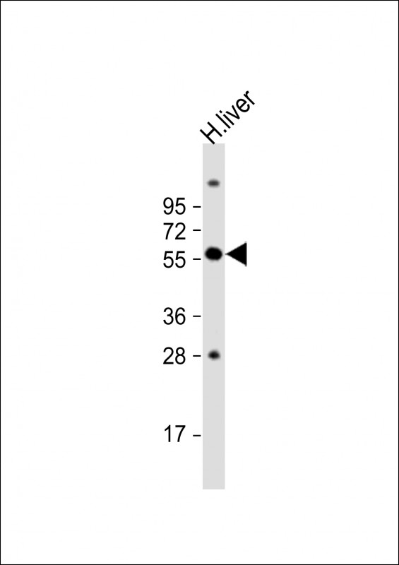 Anti-SLC11A1 Antibody (Center) at 1:1000 dilution + human liver lysate Lysates/proteins at 20 μg per lane. Secondary Goat Anti-Rabbit IgG, (H+L), Peroxidase conjugated at 1/10000 dilution. Predicted band size : 60 kDa Blocking/Dilution buffer: 5% NFDM/TBST.