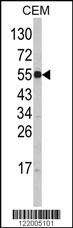 Western blot analysis of SLC11A1 Antibody (Center) (Cat. APR10923G) in CEM cell line lysates (35ug/lane). SLC11A1 (arrow) was detected using the purified Pab. |