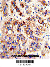 Formalin-fixed and paraffin-embedded human hepatocarcinoma with PON3 Antibody (N-term), which was peroxidase-conjugated to the secondary antibody, followed by DAB staining. This data demonstrates the use of this antibody for immunohistochemistry; clinical relevance has not been evaluated.