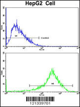 Flow cytometric analysis of HepG2 cells using PON3 Antibody (N-term)(bottom histogram) compared to a negative control cell (top histogram). FITC-conjugated goat-anti-rabbit secondary antibodies were used for the analysis. |