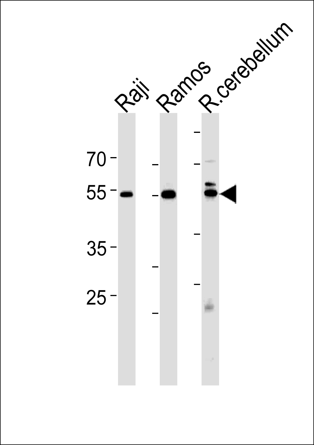 CD24 Antibody (N-Term) (Cat. APG02485G) western blot analysis in Raji,Ramos cell line and rat cerebellum tissue lysates (35ug/lane).This demonstrates the CD24 antibody detected the CD24 protein (arrow).
