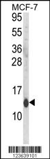 Western blot analysis of CD24 Antibody (N-Term) (Cat. APG02485G) in MCF-7 cell line lysates (35ug/lane). CD24 (arrow) was detected using the purified Pab.