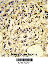 Formalin-fixed and paraffin-embedded human breast carcinoma reacted with CD24 Antibody (N-Term), which was peroxidase-conjugated to the secondary antibody, followed by DAB staining. This data demonstrates the use of this antibody for immunohistochemistry; clinical relevance has not been evaluated. |