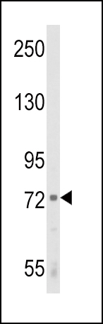 Western blot analysis of ALOX12 Antibody (C-term) (Cat. APR10855G) in K562 cell line lysates (35ug/lane). ALOX12 (arrow) was detected using the purified Pab.