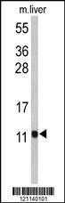 Western blot analysis of PCBD1 Antibody (Center) (Cat. APR10902G) in mouse liver tissue lysates (35ug/lane). PCBD1 (arrow) was detected using the purified Pab.