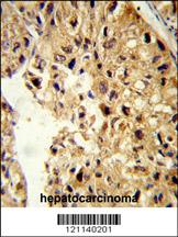 Formalin-fixed and paraffin-embedded human hepatocarcinoma reacted with PCBD1 Antibody (Center), which was peroxidase-conjugated to the secondary antibody, followed by DAB staining. This data demonstrates the use of this antibody for immunohistochemistry; clinical relevance has not been evaluated.