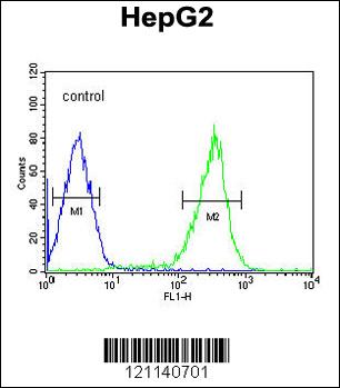 PCBD1 Antibody (Center) (Cat. APR10902G) flow cytometric analysis of HepG2 cells (right histogram) compared to a negative control cell (left histogram).FITC-conjugated goat-anti-rabbit secondary antibodies were used for the analysis. |