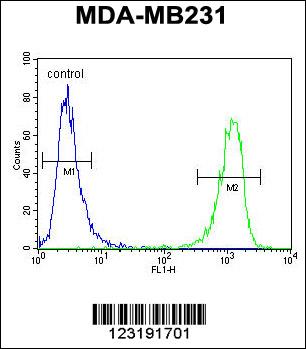 HRIHFB2025 Antibody (C-term) (Cat. AMM08592G) flow cytometric analysis of MDA-MB231 cells (right histogram) compared to a negative control cell (left histogram).FITC-conjugated goat-anti-rabbit secondary antibodies were used for the analysis. |