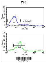 PPP3R2 Antibody (N-term) (Cat. AMM08667G) flow cytometric analysis of 293 cells (bottom histogram) compared to a negative control cell (top histogram).FITC-conjugated goat-anti-rabbit secondary antibodies were used for the analysis. |