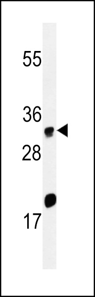 Western blot analysis of ELOVL5 Antibody (C-term) (Cat. APR10869G) in Hela cell line lysates (35ug/lane). ELOVL5 (arrow) was detected using the purified Pab.