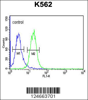 RHBG Antibody (C-term) (Cat. APR10921G) flow cytometric analysis of K562 cells (right histogram) compared to a negative control cell (left histogram).FITC-conjugated goat-anti-rabbit secondary antibodies were used for the analysis. |