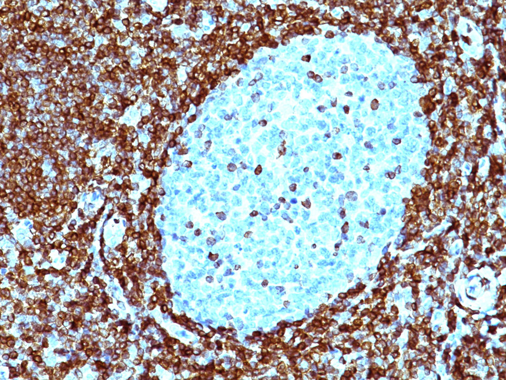 This antibody recognizes a protein of 25-26kDa, identified as the bcl-2?lpha oncoprotein. It shows no cross-reaction with Bcl-x or Bax protein. Expression of bcl-2?lpha oncoprotein inhibits the programmed cell death (apoptosis). In most follicular lymphomas, neoplastic germinal centers express high levels of bcl-2?lpha protein, whereas the normal or hyperplastic germinal centers are negative. Consequently, this antibody is valuable when distinguishing between reactive and neoplastic follicular proliferation in lymph node biopsies. It may also be used in distinguishing between those follicular lymphomas that express bcl-2 protein and the small number in which the neoplastic cells are bcl-2 negative.