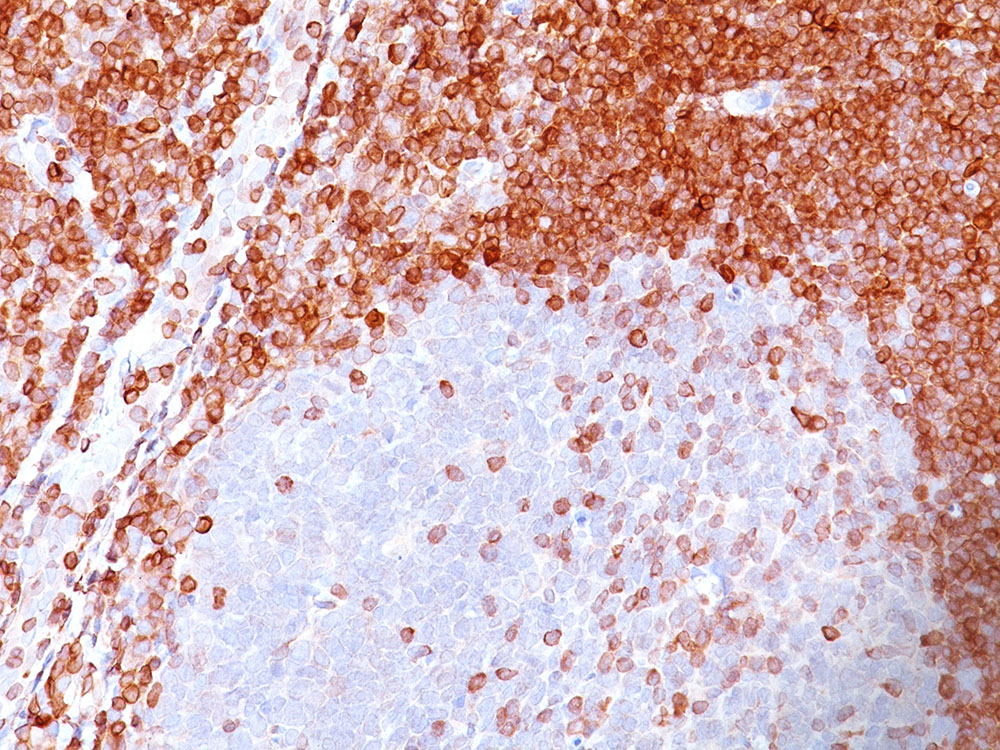This antibody recognizes a protein of 25-26kDa, identified as the bcl-2?lpha oncoprotein. It shows no cross-reaction with Bcl-x or Bax protein. Expression of bcl-2?lpha oncoprotein inhibits the programmed cell death (apoptosis). In most follicular lymphomas, neoplastic germinal centers express high levels of bcl-2?lpha protein, whereas the normal or hyperplastic germinal centers are negative. Consequently, this antibody is valuable when distinguishing between reactive and neoplastic follicular proliferation in lymph node biopsies. It may also be used in distinguishing between those follicular lymphomas that express bcl-2 protein and the small number in which the neoplastic cells are bcl-2 negative.
