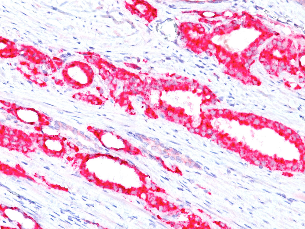 This antibody recognizes a protein of 54kDa, which is identified as AMACR, also known as p504S. It is an enzyme that is involved in bile acid biosynthesis and β-oxidation of branched-chain fatty acids. AMACR is expressed in cells of premalignant high-grade prostatic intraepithelial neoplasia (HGPIN) and prostate adenocarcinoma. The majority of the carcinoma cells show a distinct granular cytoplasmic staining reaction. AMACR is present at low or undetectable levels in glandular epithelial cells of normal prostate and benign prostatic hyperplasia. A spotty granular cytoplasmic staining is seen in a few cells of the benign glands.