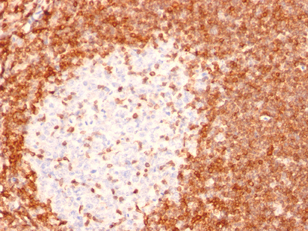 Formalin-paraffin human tonsil stained with Bcl-2 Ab (8C8). Note cell membrane and cytoplasmic staining.