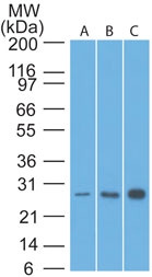 Western blot analysis of Bcl-2 in human A) HeLa, B) A549 and C) MCF7 lysate using Bcl-2 Ab (8C8). |