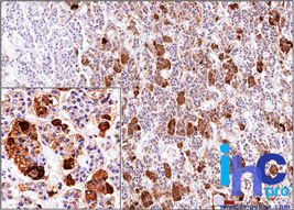 ACTH (same as Corticotropin) is a 39 amino acid active peptide produced by the anterior pituitary. This MAb is specific to Synacthen (aa1-24 of ACTH); does not react with CLIP (aa17-39 of ACTH). POMC (pro-opiomelanocortin or corticotropin-lipotropin) is a 267 amino acid polypeptide hormone precursor that goes through extensive, tissue-specific posttranslational processing by convertases. POMC is cleaved into ten hormone chains named NPP, ACTH, alpha-MSH (Melanocyte Stimulating Hormone), beta-MSH, gamma-MSH, CLIP (corticotropin-like intermediary peptide), Lipotropin-beta, Lipotropin-gamma, beta-endorphin and Met-enkephalin. ACTH is also produced by cells of immune system (T-cells, B-cells, and macrophages) in response to stimuli associated with stress. Anti-ACTH is a useful marker in classification of pituitary tumors and the study of pituitary disease. It reacts with ACTH-producing cells (corticotrophs). It also may react with other tumors (e.g. some small cell carcinomas of the lung) causing paraneoplastic syndromes by secreting ACTH.