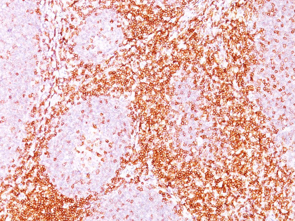 Formalin-fixed, paraffin-embedded human tonsil (20X) stained with CD6 MAb (C6/372). |