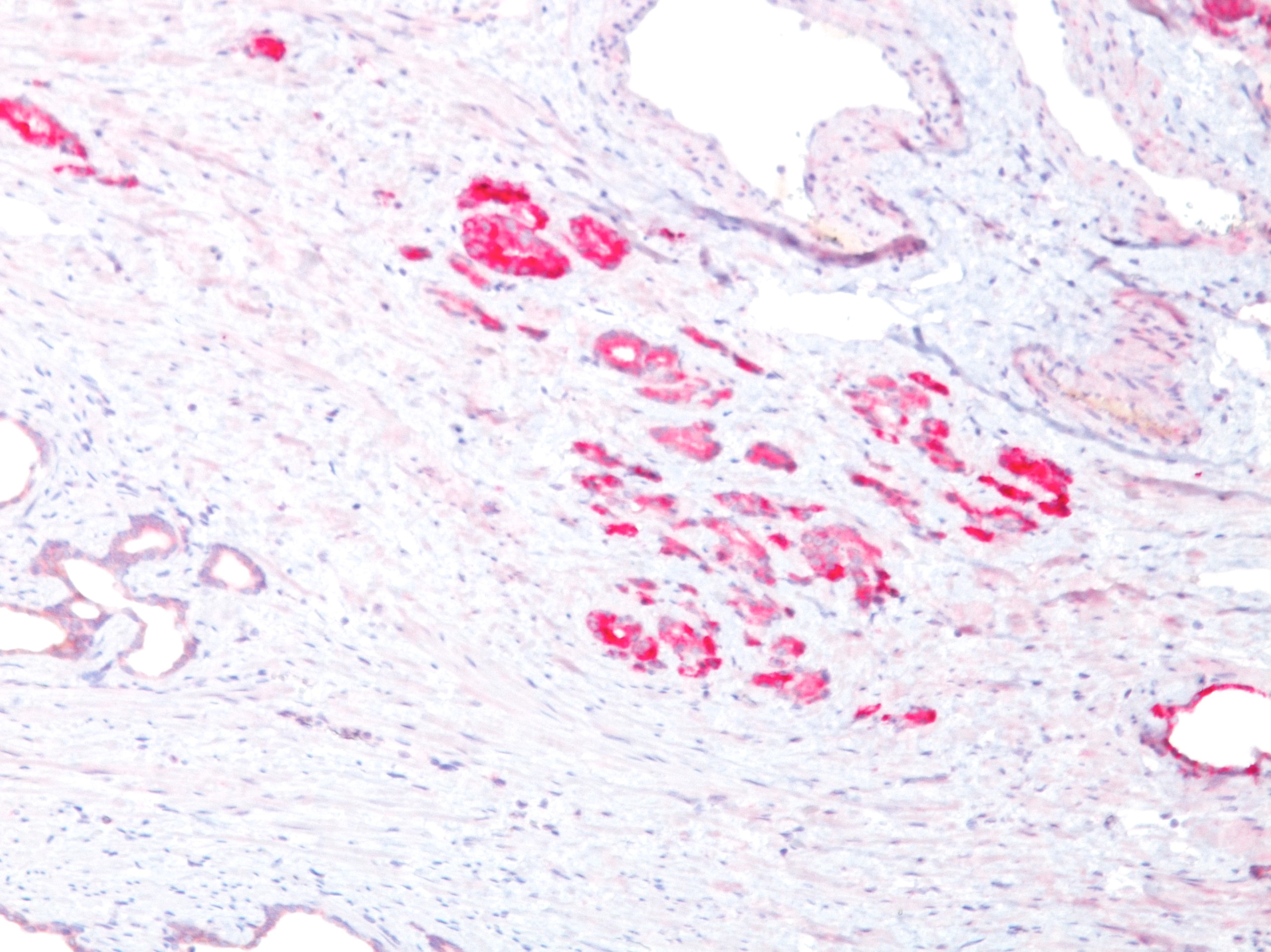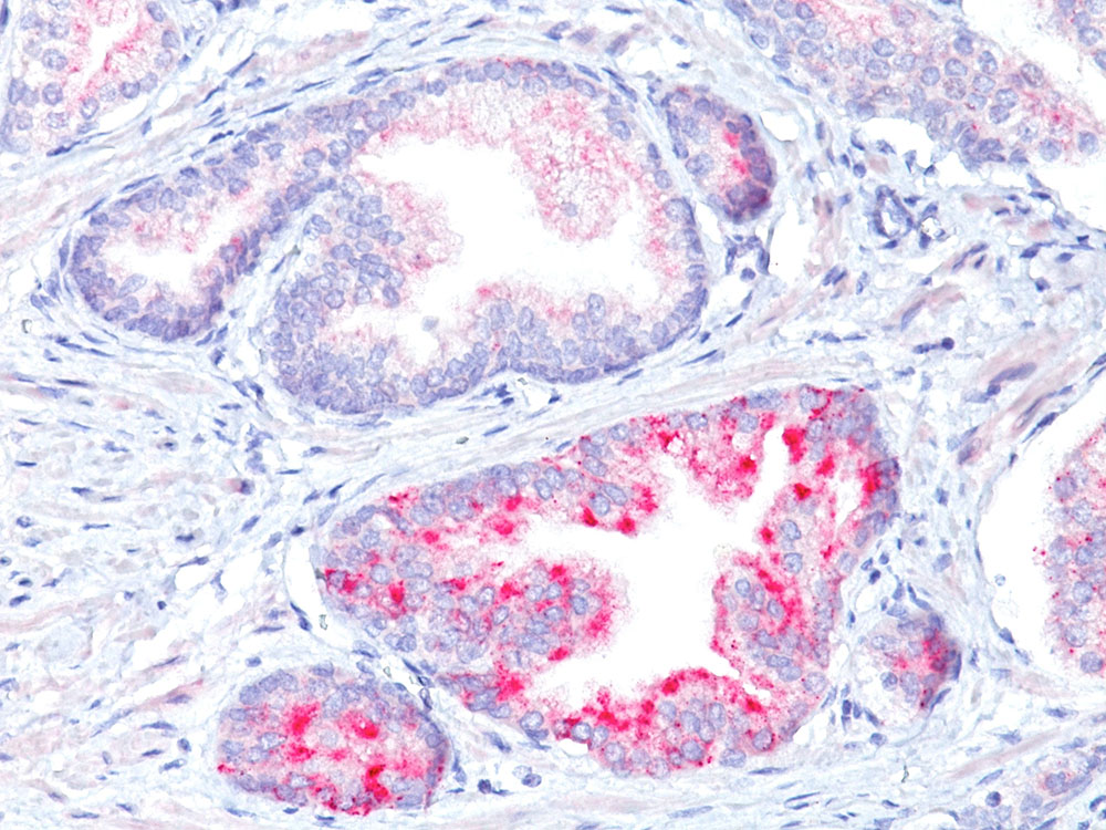 This antibody recognizes a protein of 54kDa, which is identified as AMACR, also known as p504S. It is an enzyme that is involved in bile acid biosynthesis and β-oxidation of branched-chain fatty acids. AMACR is expressed in cells of premalignant high-grade prostatic intraepithelial neoplasia (HGPIN) and prostate adenocarcinoma. The majority of the carcinoma cells show a distinct granular cytoplasmic staining reaction. AMACR is present at low or undetectable levels in glandular epithelial cells of normal prostate and benign prostatic hyperplasia. A spotty granular cytoplasmic staining is seen in a few cells of the benign glands.