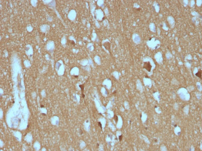 This MAb reacts with an extracellular domain (close to transmembrane) of CD56/NCAM. Three isoforms of neural cell adhesion molecule (NCAM) are produced by differential splicing of the RNA transcript from a single gene. The 135kDa isoform is the basic molecule, which is glycosylated or sialylated to produce the mature species. Anti-CD56 recognizes two proteins of the neural cell adhesion molecule, the basic molecule expressed on most neuroectodermally derived tissues and neoplasms (e.g. retinoblastoma, medulloblastomas, astrocytomas, neuroblastomas, and small cell carcinomas). It is also expressed on some mesodermally derived tumors (rhabdomyosarcoma). Anti-CD56 plays an important role in the diagnosis of nodal and nasal NK/T-cell lymphomas.