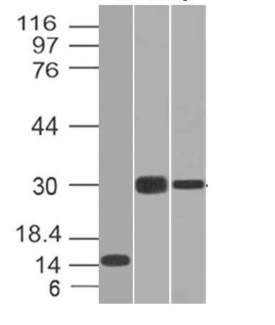Western Blot of Recombinant, Panc-28 and PANC1 Cell Lysates using CELA3B Monoclonal Antibody (CELA3B/1218). |