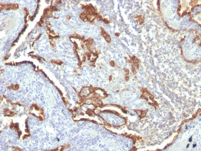 Formalin-fixed, paraffin-embedded human Lung Carcinoma stained with Cytokeratin 7 Monoclonal Antibody (KRT7/760 + OV-TL12/30) |