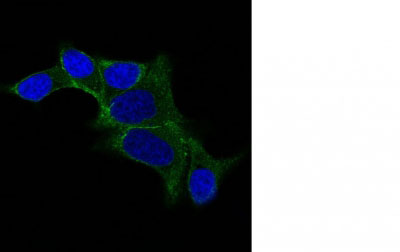 IF staining of LNCap cells using AF488 labeled ODC1 Monoclonal Antibody (ODC1/487) (Green). DAPI was used to stain the cell nuclei (blue).
