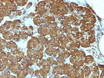 Formalin-fixed, paraffin-embedded human Pancreas stained with Cytochrome C Monoclonal Antibody (7H8.2C12). |