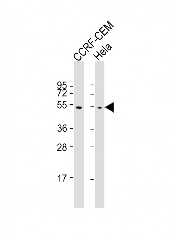 All lanes : Anti-TBB1 Antibody at 1:1000 dilution Lane 1: CCRF-CEM whole cell lysate Lane 2: Hela whole cell lysate Lysates/proteins at 20 μg per lane. Secondary Goat Anti-mouse IgG, (H+L), Peroxidase conjugated at 1/10000 dilution. Predicted band size : 50 kDa Blocking/Dilution buffer: 5% NFDM/TBST.