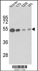 Western blot analysis of anti-TBB1 Antibody (Cat. AMM08112G) in mouse brain tissue, Y79, CEM and 293 lysates (35μg/lane). TBB1 (arrow) was detected using the purified Mab.(1μg/ml)