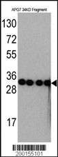 Western blot analysis of anti-APG7 Monoclonal Antibody (Cat. APR07072G) by Recombinant APG7 protein (Fragment 34KD). APG7 protein (Fragment 34KD)(arrow) was detected using the ascites Mab. |