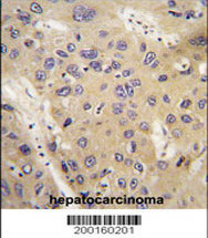 Formalin-fixed and paraffin-embedded human hepatocarcinoma tissue and lung carcinoma tissue reacted with APG12L Monoclonal Antibody (Cat. APR07067G), which was peroxidase-conjugated to the secondary antibody, followed by DAB staining. This data demonstrates the use of this antibody for immunohistochemistry; clinical relevance has not been evaluated.