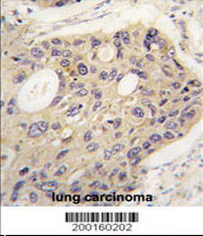 Formalin-fixed and paraffin-embedded human lung carcinoma tissue reacted with APG12L Monoclonal Antibody (Cat. APR07067G), which was peroxidase-conjugated to the secondary antibody, followed by DAB staining. This data demonstrates the use of this antibody for immunohistochemistry; clinical relevance has not been evaluated. |
