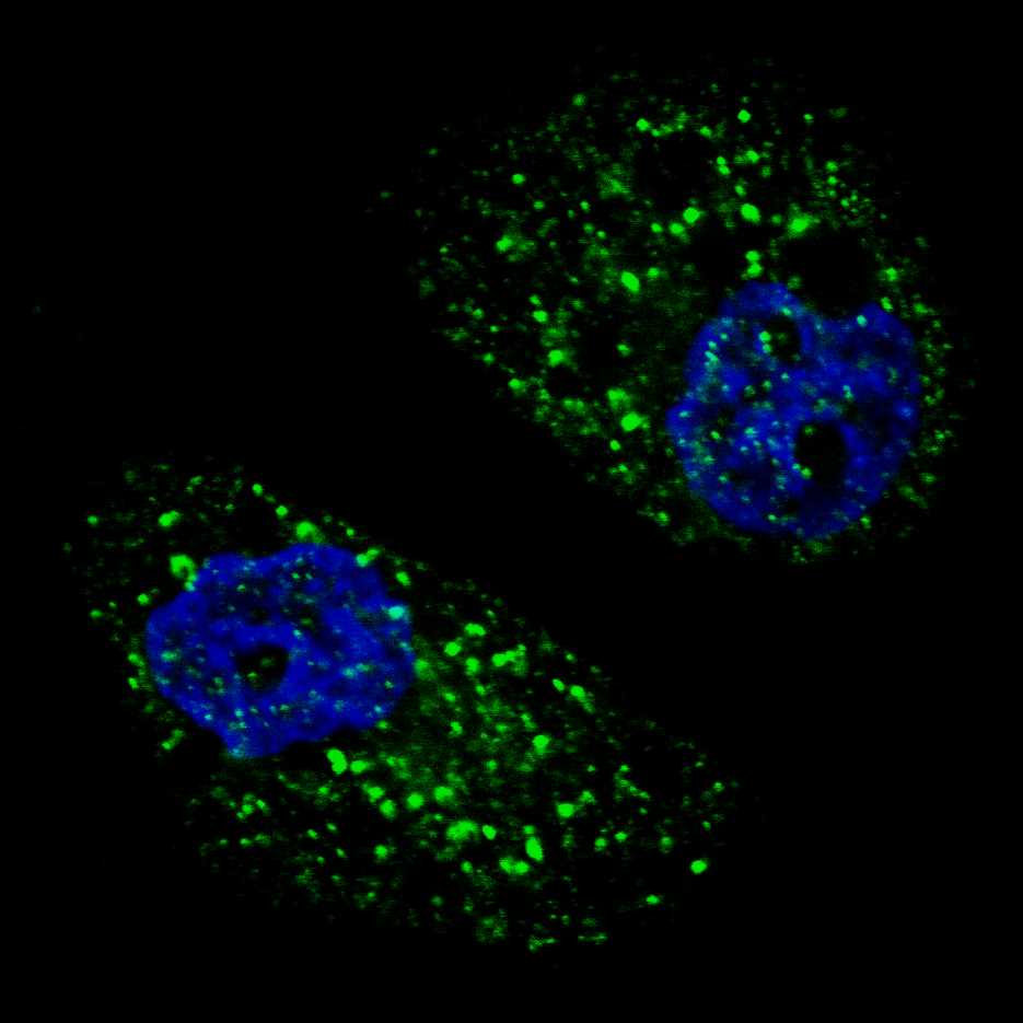 Fluorescent image of U251 cells stained with APR06985G Beclin1 antibody.U251 cells were treated with Chloroquine (50 μM,16h), then fixed with 4% PFA (20 min), permeabilized with Triton X-100 (0.2%, 30 min). Cells were then incubated with APR06985G Beclin1 primary antibody (1:100, 2 h at room temperature). For secondary antibody, Alexa Fluor? 488 conjugated donkey anti-mouse antibody (green) was used (1:1000, 1h). Nuclei were counterstained with Hoechst 33342 (blue) (10 μg/ml, 5 min). Beclin1 immunoreactivity is localized to autophagic vacuoles in the cytoplasm of U251 cells.